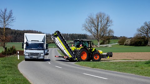 Die 120°-Transportposition und der nahe am Traktor liegende Schwerpunkt sorgen für höchste Stabilität. Somit sind Sie auch auf der Straße sicher und wendig unterwegs. In Transportposition wird das Mähwerk außerdem automatisch mechanisch gesichert.